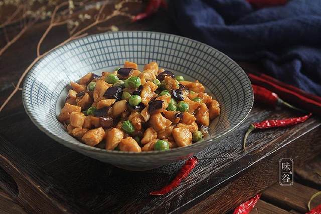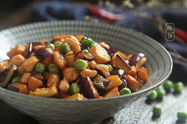 【材料】:茄子 1根、鸡胸肉 2块、豌豆 1把、蒜末 适量、白糖 1小勺、干淀粉 适量、香菇酱 1勺、盐 适量、生抽 1勺、