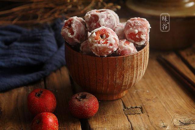 山楂雪球相比传统糖葫芦没有硬脆的糖衣,外皮上的甜甜的糖溶入山楂的酸,酸甜适度,十分诱人,而且白里透红的很漂亮,挂着的糖霜也像雪衣,是不是很应景?