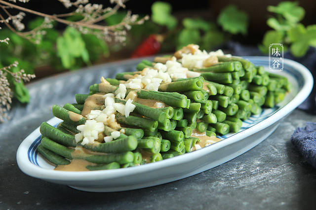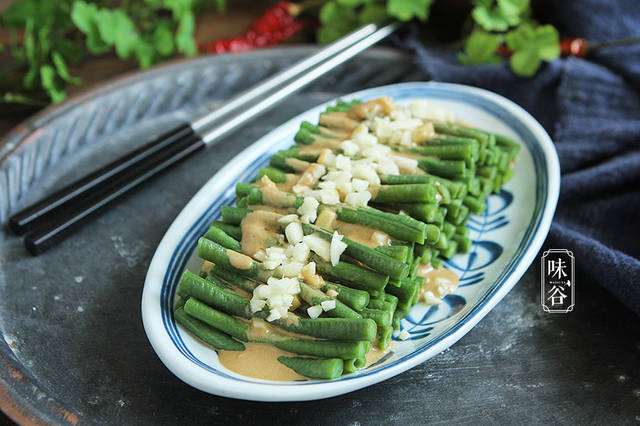 【材料】:豆角 1把、芝麻酱 3汤匙、生抽 2汤匙、香醋 1汤匙、水 1汤匙、盐 1茶匙、蒜 2瓣