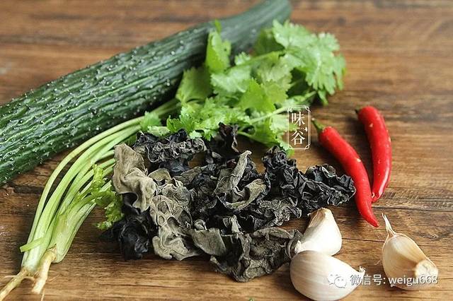 【材料】:黄瓜1根、干木耳15克、小米椒2个、蒜3瓣、香菜2颗、生抽2汤匙、蚝油1汤匙、香醋2汤匙、白糖1茶匙、香油半汤匙