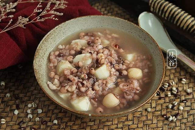 【材料】:芡实 1把、赤小豆 1把、山药 100克、莲子 1把、薏米 1把、大米 1把