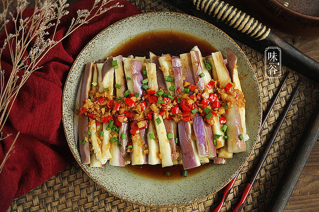 【做法】:1、把茄子切成细条,放入水里浸泡10分钟,泡的时候拿个碟子压一压;