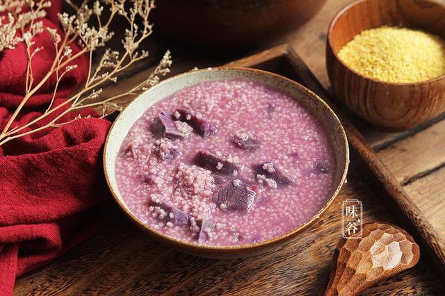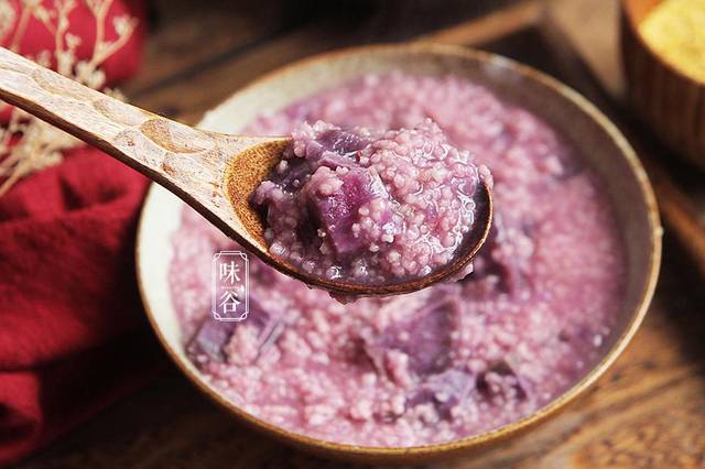 小米熬粥营养价值丰富,有“代参汤”之美称。由于小米不需精制,它保存了许多的维生素和无机盐,小米中的维生素B1可达大米的几倍;不仅能食用还能入药,有清热、滋阴、补肾利尿的功效。并且小米不会刺激肠道壁,是比较温和的纤维质,很容易被人体吸收。紫薯富含丰富的花青素,有抗自由基、防衰老、减肥瘦身、抑制老年痴呆症的效果,所以女人和中老年人可以多喝紫薯小米粥,可以做早餐,也可以做晚餐,更可以做减肥食谱。