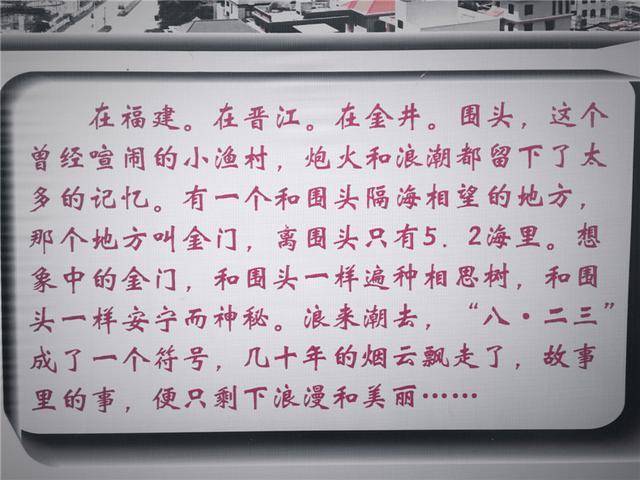 有海峡第一村之称的福建围头村位于晋江市东南沿海突出部,它东临台湾海峡,正面距金门岛仅5.2海里,是祖国大陆离金门岛最近的地方。围头村与金门,不仅民间经贸交流日渐密切,也是大陆与台湾通婚最多的渔村。围头村已有一千三百年左右的历史,以“南北洋舟船往来必泊之地”而闻名。