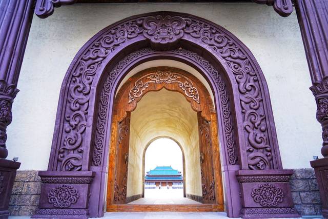 在蒙古源流的腾格里广场,前面的大道中央建成的火撑子是亚洲最大的一个祭火用火撑子,通体是紫铜锻打花纹,以6只展翅腾飞的海东青造型为主,周围是8个麒麟造型的珠拉,因为蒙古族崇尚火,火在他们看来是纯洁的象征和神灵的化身,在碧蓝的天空下格外有气势。