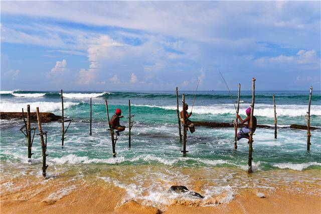 还没来斯里兰卡之前,就对杂志上看到的高跷渔夫画面印象深刻,蔚蓝色的大海上,几个黝黑的渔夫坐在简易的木桩上,成了一道特别的风景。