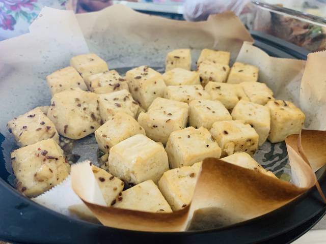 我们今用的烤箱是千石阿拉丁烤箱,温度比较高,如果自己家的烤箱温度比较低的话那就加长烘烤时间,一直烘烤到豆腐表面变焦脆即可。