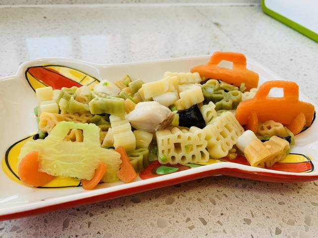 今天的意面我还用胡萝卜和青萝卜做了一些小汽车形状的插片,把它们组装在一起就是一个立体的小汽车儿了。如果宝妈们心灵手巧再做出更多的形状的话欢迎来一起讨论哦~
