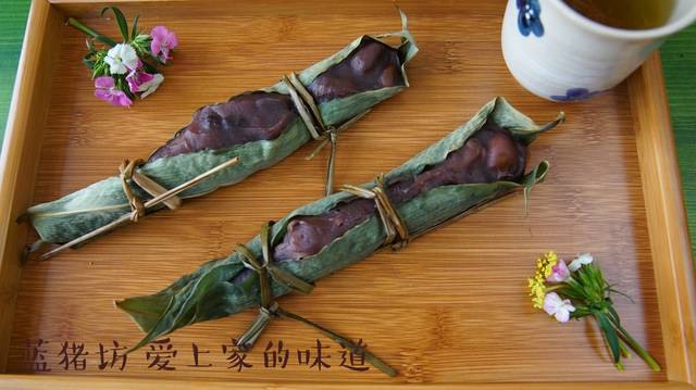煮熟的栗子8个,煮红豆200g,栗子汤20g,低粉40g,淀粉20g,盐适量,竹子叶4片,马莲草4根