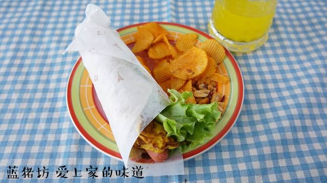 卷饼1张,鸡蛋1个,火腿肠1根,生菜叶一片,海鲜酱适量,食用油适量