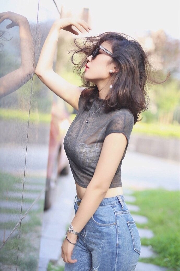 就比如这张图片中,大家应该有注意到这位美女的发型,还有她的服装,我们现在就来说一下,它们之间的联系和一些细节上的东西。先讨论一下衣服的整体构造吧!上衣是一款短款腹部露出,袖子也只有一点的灰色上衣,衣服有些雾蒙蒙的,感觉像是纱质的,又有一些磨砂的感觉。内搭的是一个白色吊带款的内衣,也非常的短,就是构成了透视装的特点。