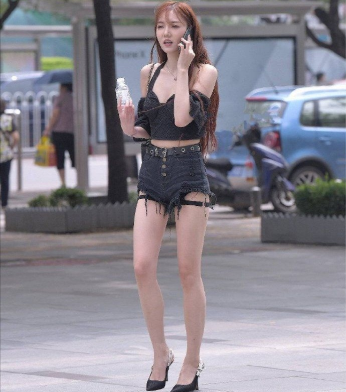 另外一位美女的穿搭有些不同,她穿的是一个粗带,露有大片肌肤的黑色短款上衣。下半身是一个腰部,有着黑色圈状皮带的流苏热裤,特别是在下部大腿处,还有黑色的系带圆圈,这样的感觉就有种套上了丝袜的feel,很性感。脚上的鞋子是尖头的高跟鞋,腿部特别的白皙修长。不知道为什么,看起来有点熟悉,似乎是跟一个漫画人物的造型特别像,这样还有一种特别的时尚风格。