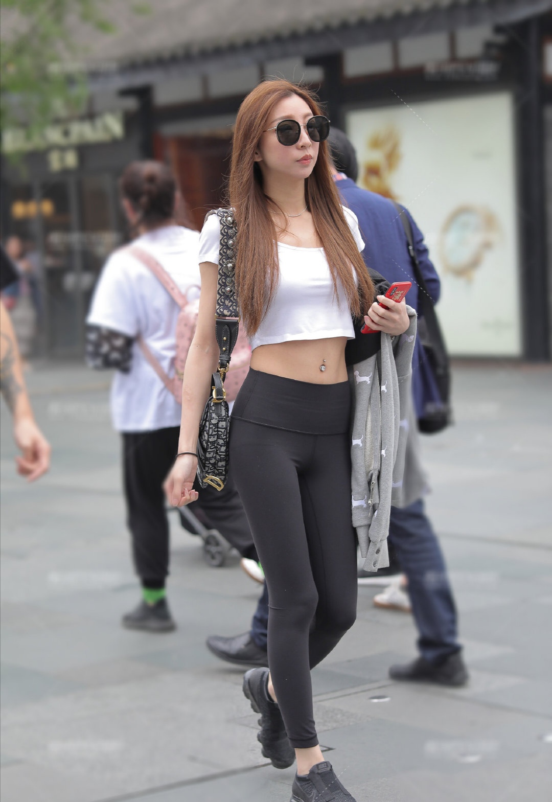 不知道大家会不会对这样的穿搭有兴趣?就是普通款的衣服,然后再搭配上一些比较少见,看起来不一样的单品。这些单品可以是一些小的配饰,比如耳环,项链等等,其实这位美女肚脐上的那个,也非常亮眼。也可以是平时会挎的包包,只要一点其他特别的东西,再配合上简单大众的整体款式,就会起到画龙点睛的作用,非常的完美。