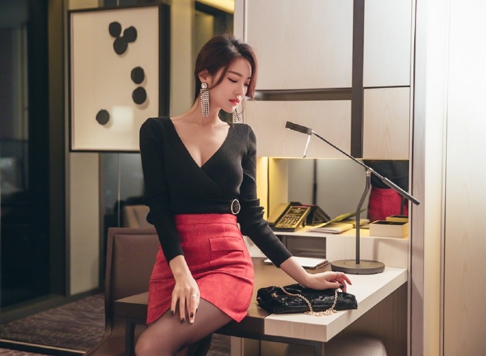 性感成熟白领,红裙配黑丝,凸显纤细美腿。