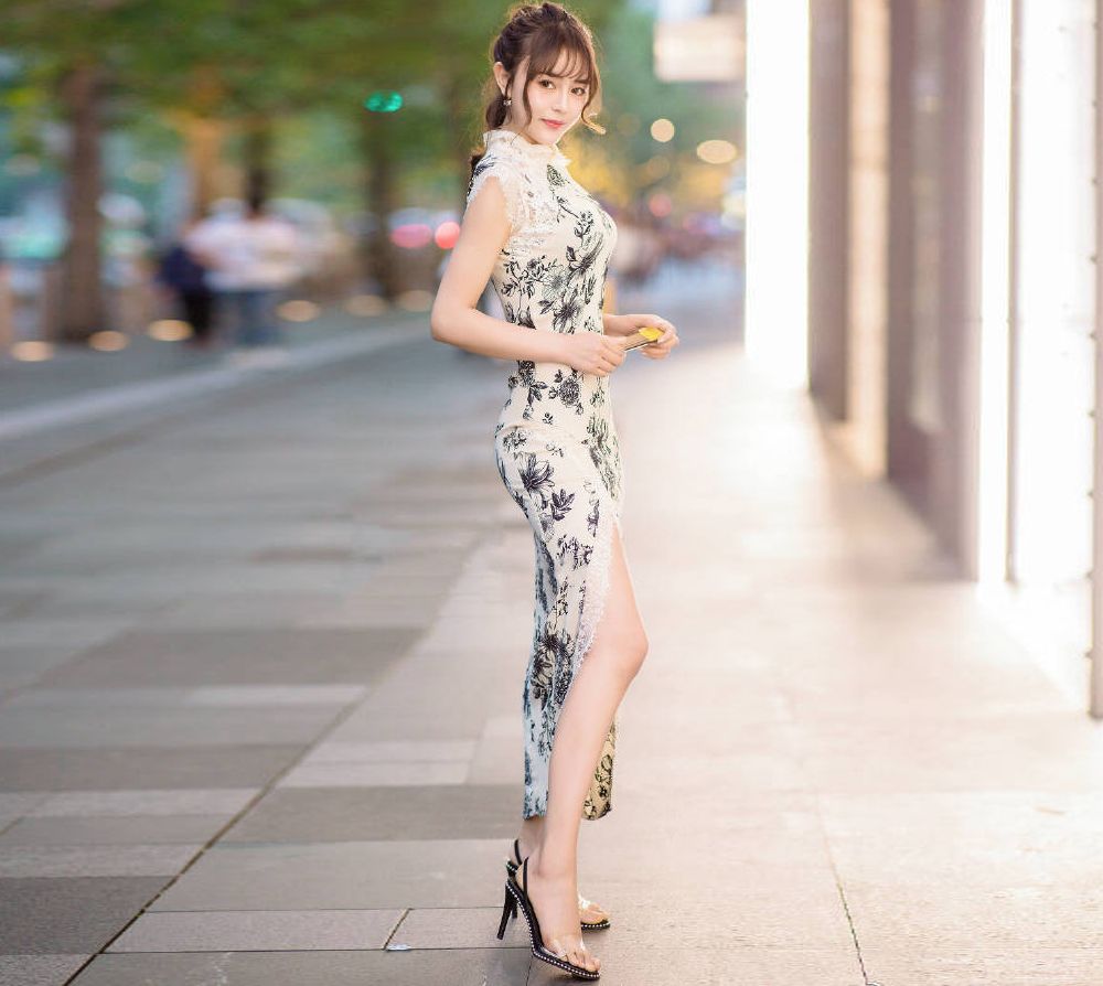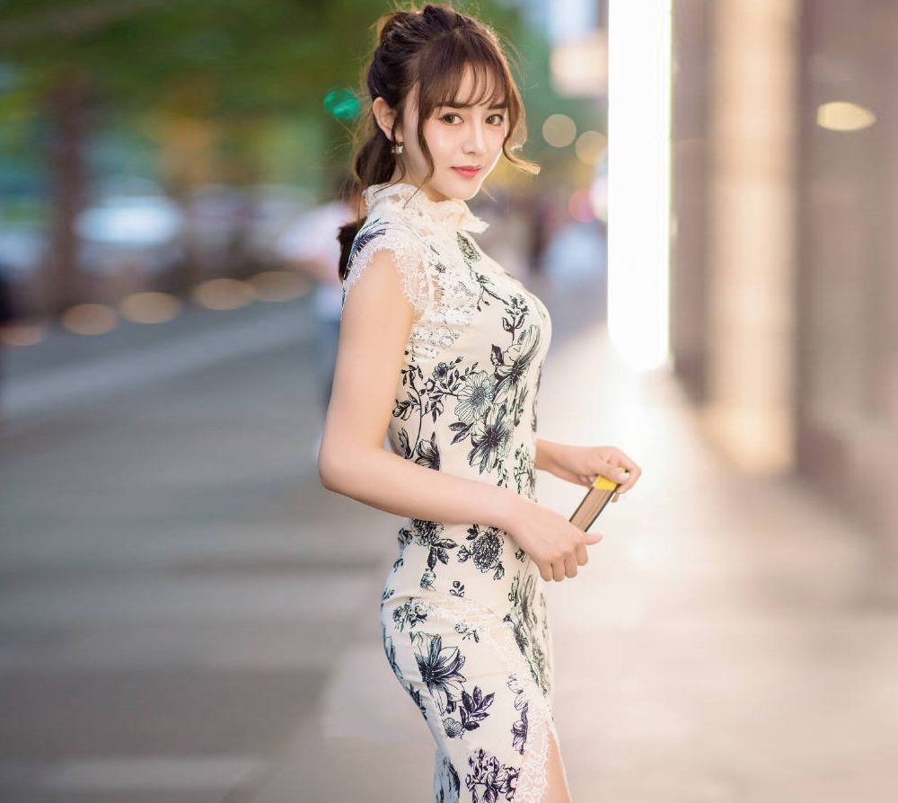 图中这位美女就是穿了一件旗袍,这个旗袍的样式也比较的新颖,白底还有上面墨色的图案,让人不禁想到了周杰伦的那首青花瓷,真的有种瓷器的精致感。美女的这件旗袍,也不是比较普通的款式,她在领口和袖边有蕾丝的设计。即使是下方开叉的地方,也选择了两条蕾丝边作为点缀。
