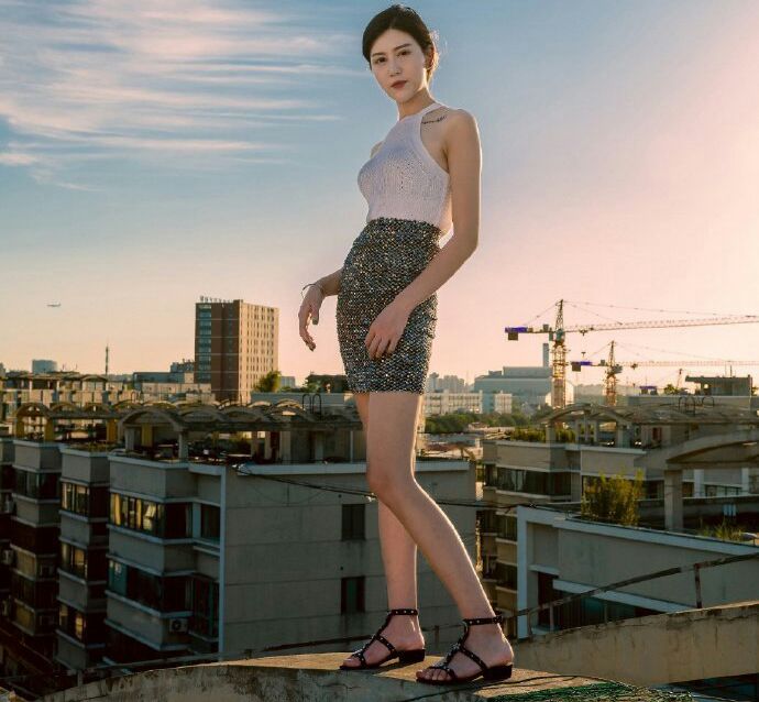 她又站起身来,用腕间的发绳将头发绑起来,显得干净利落。同时,这样的发型也可以将她的鸭蛋脸完美的显示出来。在这张图中,她背对着阳光,一个人站在平台上,仿佛要将这座城市尽收眼底。她修长的双腿和曼妙的身材,在这一瞬间使得身后的城市都黯然失色。不过在这里也要提醒大家,这样的动作是比较危险的,所以要慎重,不要为了一时的快乐而盲目模仿哦。