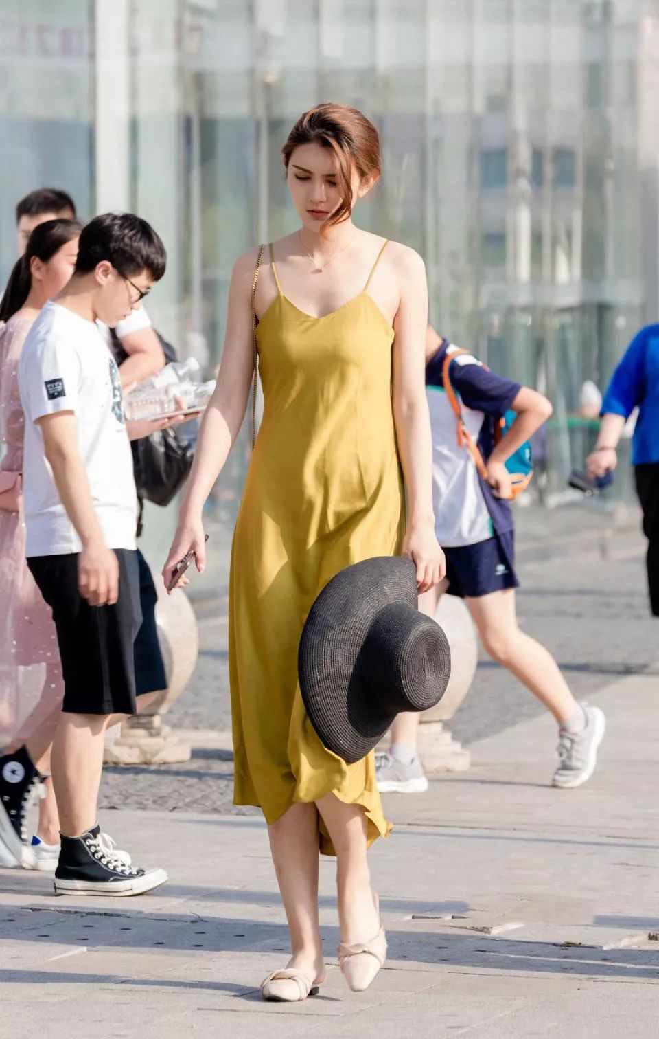 这位美女选择的是裸色尖头凉拖,鞋面上是简单的褶皱设计,增加优雅质感。因为她本身皮肤白皙,选择裸色能整体肤色相统一,大方露出脚踝,平底鞋照样可以拉长双腿。淡黄色吊带连衣裙清清爽爽,下摆和腰身都是比较宽松的,余量可以轻松遮住小腹和大腿的肉肉,是显瘦的好帮手。美女手里拿着的黑色草帽和淡黄色的连衣裙特别搭,这整身搭配颜色都是成大块出现的,给人沉稳的感觉,人群中属她最亮眼。