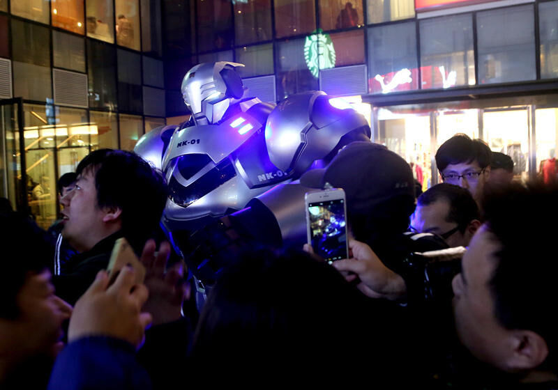 11月16日,北京,一款酷似机器人在他的主人陪同下来到三里屯“逛街”。这款能说话、能走路的机器人高约两米,由里面的人控制前行。