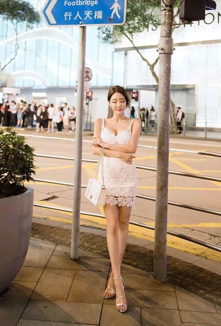 夜景下的美女,白色吊带镂空短裙,性感大长腿。