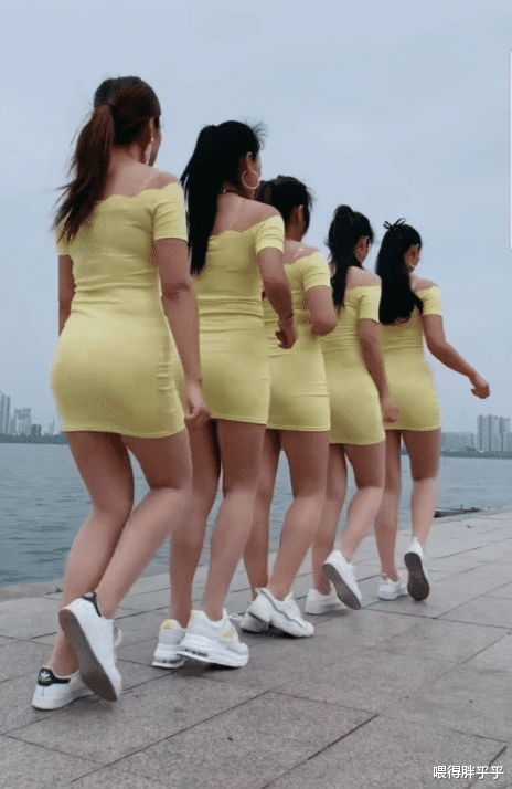 正宗的大嘛,整齐的站成一排,她们有规律的动着,似乎是在拍某一个舞蹈,看他们专心的样子,看来广场舞真的对她们很重要啊。我们可以看到大妈整体穿着一件黄色紧身包臀裙,一字肩的设计露出好看的锁骨,让整个人看起来更加的时尚。紧身的裙子讲讲都好笑的好身材购的出来,同时短裙又将一双笔直修长的大长腿勾勒出来,不得不说大妈都这个年纪身材保持的可真是好啊!黄色的衣服可真的是应景呀,真的像门前大桥下那首歌啊!一双小白鞋更是显年轻啊,看来大妈们真的是有一颗年轻的心啊!