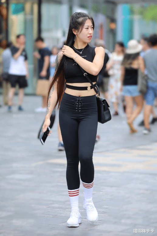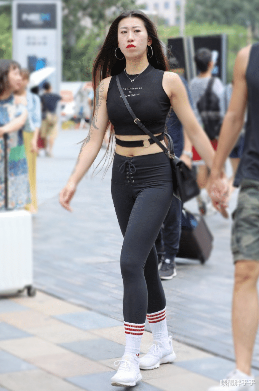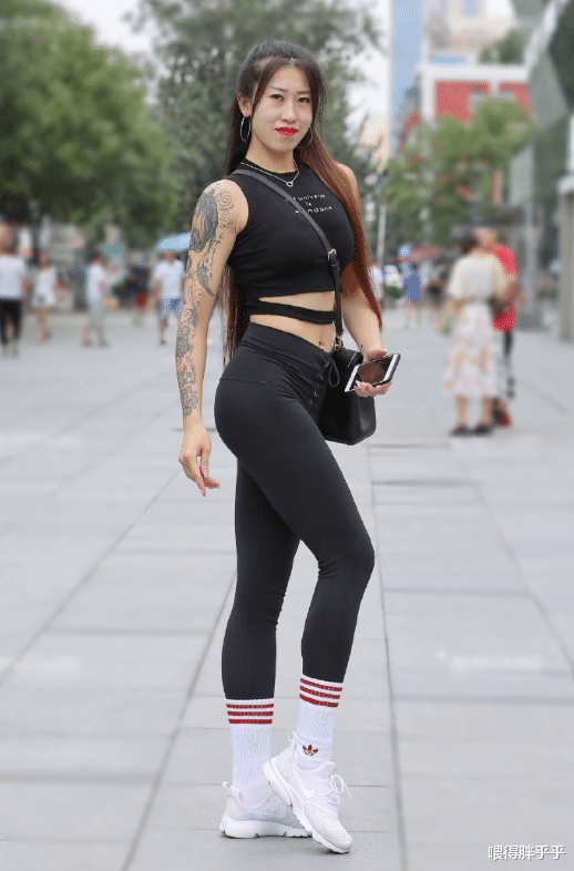 一身黑色的运动瑜伽衣,外加一双长筒白色袜子,搭配一双白色运动鞋,玲珑的身材尽收眼底。
