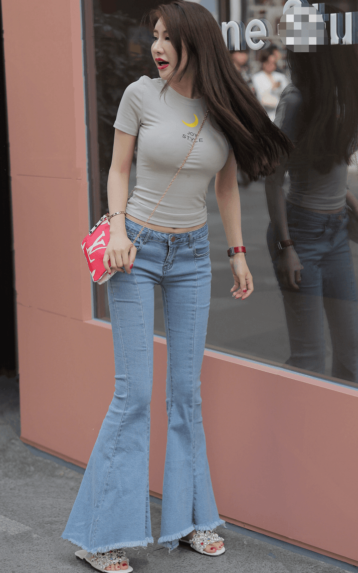 图片中的这位美女,她的身材真好,大部分女生都不会拥有她这样的好身材。这位女生虽然是一位中国人,但是她这个身材挺像欧美女生的身材的。这位女生的个子挺高的,但是她非常瘦。今天这位女生的腿上穿了一条蓝色的牛仔裤,这条蓝色的牛仔裤非常有个性。这条裤子的款式是喇叭裤设计,他的裤腿非常宽。而且这个裤脚还有一些忙边设计的这种设计是非常时尚的。美女穿着这条裤子显得她的腿很细,最主要的是有一种腿长2米8的感觉。