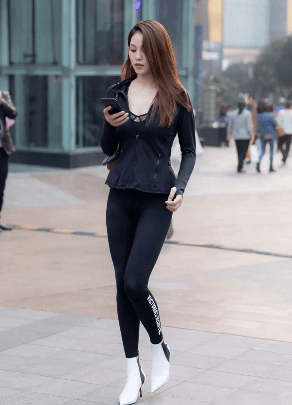 图片中的这位女生,她的身上穿的是一身黑色的衣服。这位女生真的很会搭配了,她这身黑色的衣服既性感又有一种酷酷的感觉。这位女生的下身穿的是一条黑色的紧身裤,这条黑色的紧身裤非常漂亮。因为这条黑色的紧身裤侧面有着白色的字母,这就让这条裤子看起来时尚了许多。美女的腿挺细的,一点赘肉都没有,她很适合穿这种黑色的紧身裤。