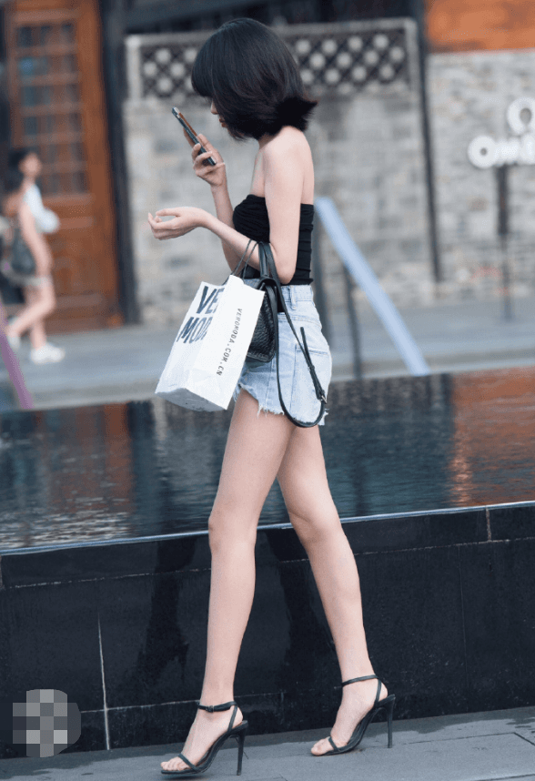 一看图上的小姐姐就知道她身材非常的好,给人的感觉都快瘦成竹竿了,小姐姐的穿衣搭配也是非常的性感,让我们一起来看看吧。小姐姐上半身穿了一件黑色的抹胸吊带,这件黑色的抹胸吊带本来是一件非常性感的衣服,但是因为小姐姐的身材实在太瘦了,无法撑起来这样的衣服,给人的感觉是胸部特别的平。小姐姐穿上这样的衣服并没有给人一种非常性感的感觉,反而给人一种太瘦的感觉。小姐姐下半身穿了一件牛仔短裤,这件牛仔短裤还是非常的适合小姐姐的,因为小姐姐的腿非常的瘦。穿这样的衣服能够将小姐姐的腿长优势完全展现出来,一双又长又细的大长腿展现在我们的眼前,这件衣服的选择还是非常不错的。