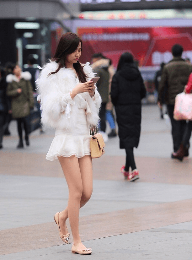 小姐姐的下半身穿了一件白色的裙子,这件白色的裙子是一层一层的,给人的感觉是层次感特别的强,并且这样的衣服让人看起来也是非常的有设计感,但是看小姐姐的腿上光溜溜的小姐姐腿上应该是连丝袜都没有穿吧,小姐姐为了露出自己的大长腿也是非常的拼命呀,看上半身穿着这样的皮草外套,腿上穿着一条薄薄的短裙,这样穿不会觉得有点冷吗?