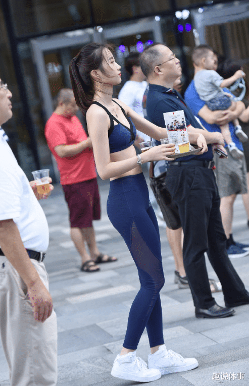 这么一套瑜伽服当然要配上运动鞋了,白色运动鞋的出现真是点睛之笔,颜色由深过渡到浅,色彩的渐变增加了层次感,非常好看。以美女的身材在穿着这样一套衣服,在街上去发各种各样的礼品,一定没有人会拒绝吧。
