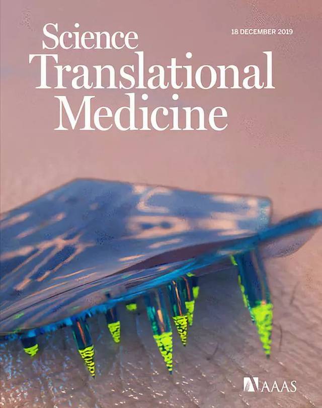 图 | 本研究为《科学 · 转化医学》封面。微针贴片(蓝色)将封装的量子点微球(绿色)递送到皮肤中。
