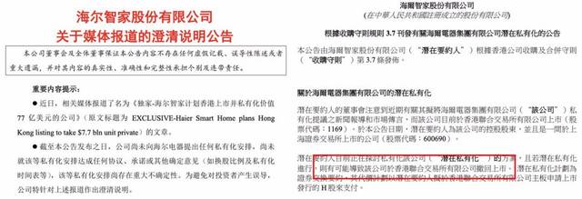 复牌前夜,海尔电器回应了海尔智家将对其私有化的计划,公告称若“潜在私有化”方案进行,可能导致海尔电器于港交所撤回上市,至此,双方的上市公告都印证了关于海尔智家私有化海尔电器一事大概率会推行下去。