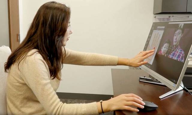图 | 一位母亲在电脑屏幕上虚拟抚摸孩子。(来源:美国西北大学)