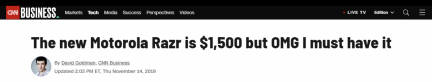 11 月 14 日,摩托罗拉正式公布了新款“刀锋(Razr)”手机,经典翻盖设计和系列元素重出江湖,在安卓系统和折叠屏的加持下寒光闪闪,格外引人注目。