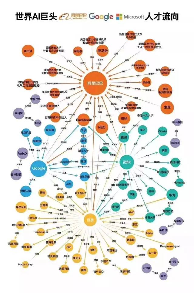 据近日传出的一份“世界 AI 巨头人才流向图”显示,目前一众 AI 领域知名公司的人才流动情况又有了新的变化趋势,其中,百度、微软成为人才流失重地,而阿里巴巴似乎是其中的最大赢家。