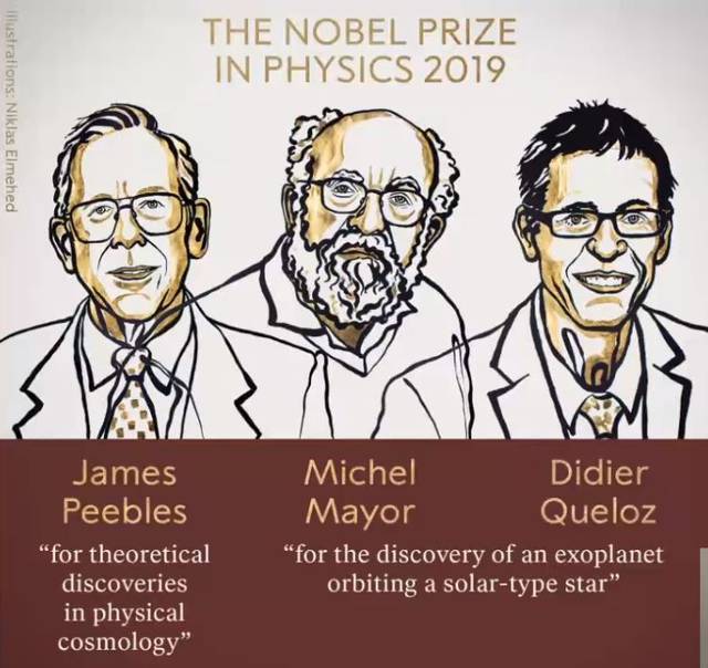 北京时间 10 月 8 日下午 5 点 50 分左右,2019 诺贝尔物理学奖评选结果揭晓——诺贝尔委员会宣布,将此奖项颁发给 James Peebles、Michel Mayor、Didier Queloz,以表彰他们在宇宙理论领域、系外行星的发现。
