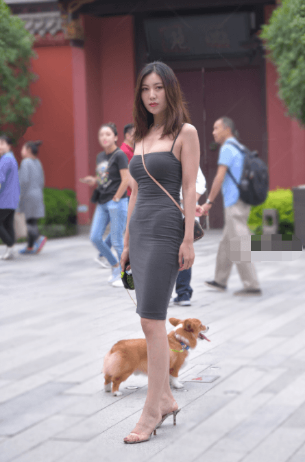 在一处景点旁边有一位小姐姐,她在遛她的小狗。我们先来看一下这位小姐姐的传达,小姐姐穿着一件吊带长裙。这件吊带长裙是修身版的设计,它的颜色是深灰色并没有达到黑色,但是它的显瘦效果也是非常的好。小姐姐的这件吊带长裙到小姐姐的膝盖上方。