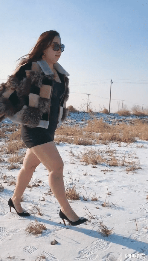这副全身上下最大的亮点就是他在外边穿的那件皮草了。少妇的这件皮草整体颜色比较暗,是有好多种颜色拼接而成的。不过说实话,起草穿起来就是洋气。少妇的脚上穿了一双黑色的高跟皮鞋。我们看得出来,少妇的腿挺粗的,但是她的腿上并没有穿光腿丝袜。少妇所在的地方地面上都是一些积雪,看来这个地方温度挺低的。没想到这位胖少妇居然不怕冷,这可还行。