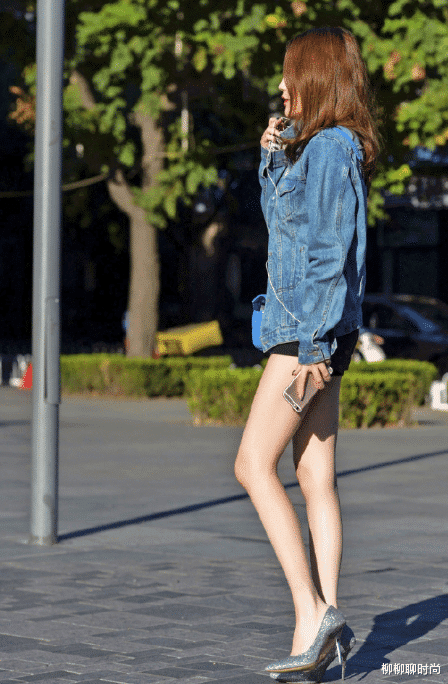 女生穿着连体衣确实挺好看的,但是不知道穿起来方不方便。这位女生在这件黑色的连体衣外面搭配了一件蓝色的牛仔外套。这件蓝色的牛仔外套比较宽松,美女穿着都快包到她下边的裤子了。这位女生的脚上穿的是一双银色的高跟凉鞋,这双银色的高跟凉鞋看起来非常具有时尚感。美女的腿真的是非常好看呀,又长又直,像这样的腿真的是很完美了。美女靠她的这双腿肯定就饿不着。