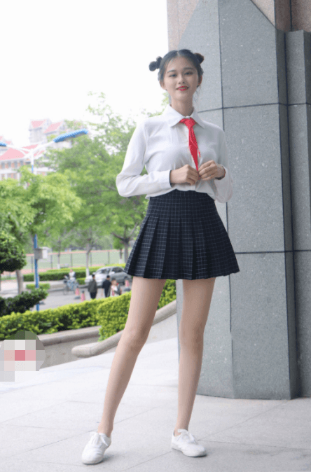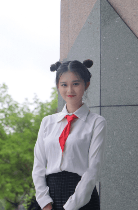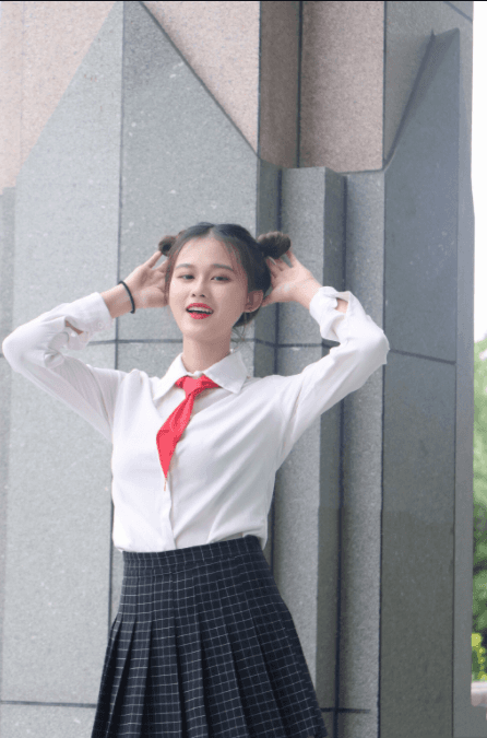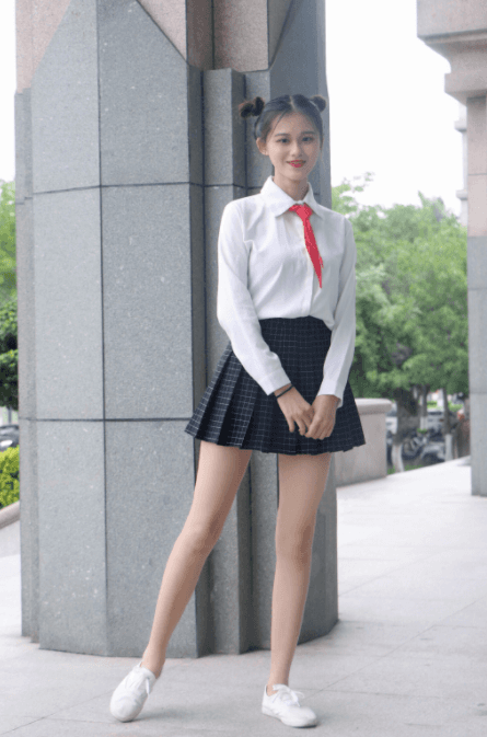 接着让我们来看一下这位小姐姐是怎么穿搭学院风的吧?小姐姐上身穿着一件白色的衬衫。白衬衫是学院风的经典搭配。小姐姐的下半身是一条百褶裙。这条百褶裙是青色的。青色接近黑色的颜色,是格子的。小姐姐将上衣衬衫扎在百褶裙里面。百褶裙提到腰部以上的位置非常的显高又显瘦。来看一下小姐姐的脖颈处。记着一根红色的丝巾,好像是一根红领巾呀!小姐姐的脚上穿着一双白色的板鞋。白色的板鞋也是学院风的经典搭配。毕竟在学校里大家穿的一般都不是高跟鞋,而是平底鞋。看一下小姐姐的妆容,她扎了两个小羊角辫儿非常的清纯可爱。其中一个有点像心形的。好像再跟你说:连我的头发都是爱你的形状。