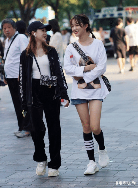 图片中两个小姐姐灿烂的笑容让人喜欢,看带黑色棒球帽的小姐姐给人一种成熟与魅力,身穿黑色外套里面搭配了短款吊带,下衣穿着高腰阔腿裤拉长了整个人的身材比例,脚下搭配一双白色运动鞋,也显得那么青春与美好。