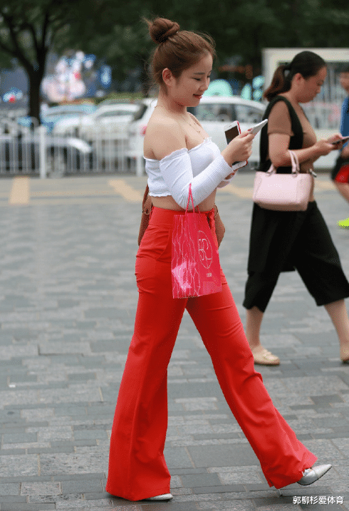 身穿白色抹胸上衣的她露出了圆润的肩膀,下身搭配一条高腰大红色,长腿喇叭裤,那条长了整个线条,遮住了腿部的肉肉。脚踩一双细高跟尖头皮鞋显得人,干练又不失成熟与魅力。小姐姐刚刚购物回来,心情美美哒。可能约了闺蜜一起吃饭,也可能和男友有一个约会,甜甜的笑容,展现了此刻她的美丽心情。