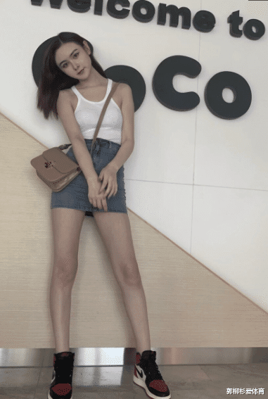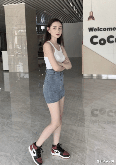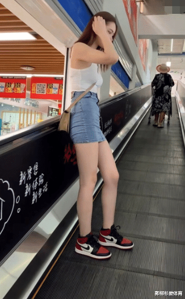 扶梯上的小姐姐微微低头,不知道在想什么呢,看小姐姐一头棕色披肩长发,穿着白色吊带背心,下身紧身包臀裙,牛仔裙真是美得让人心动呀。搭配一双黑红相间的耐克鞋看起来真是活力满满,诱惑十足哟。