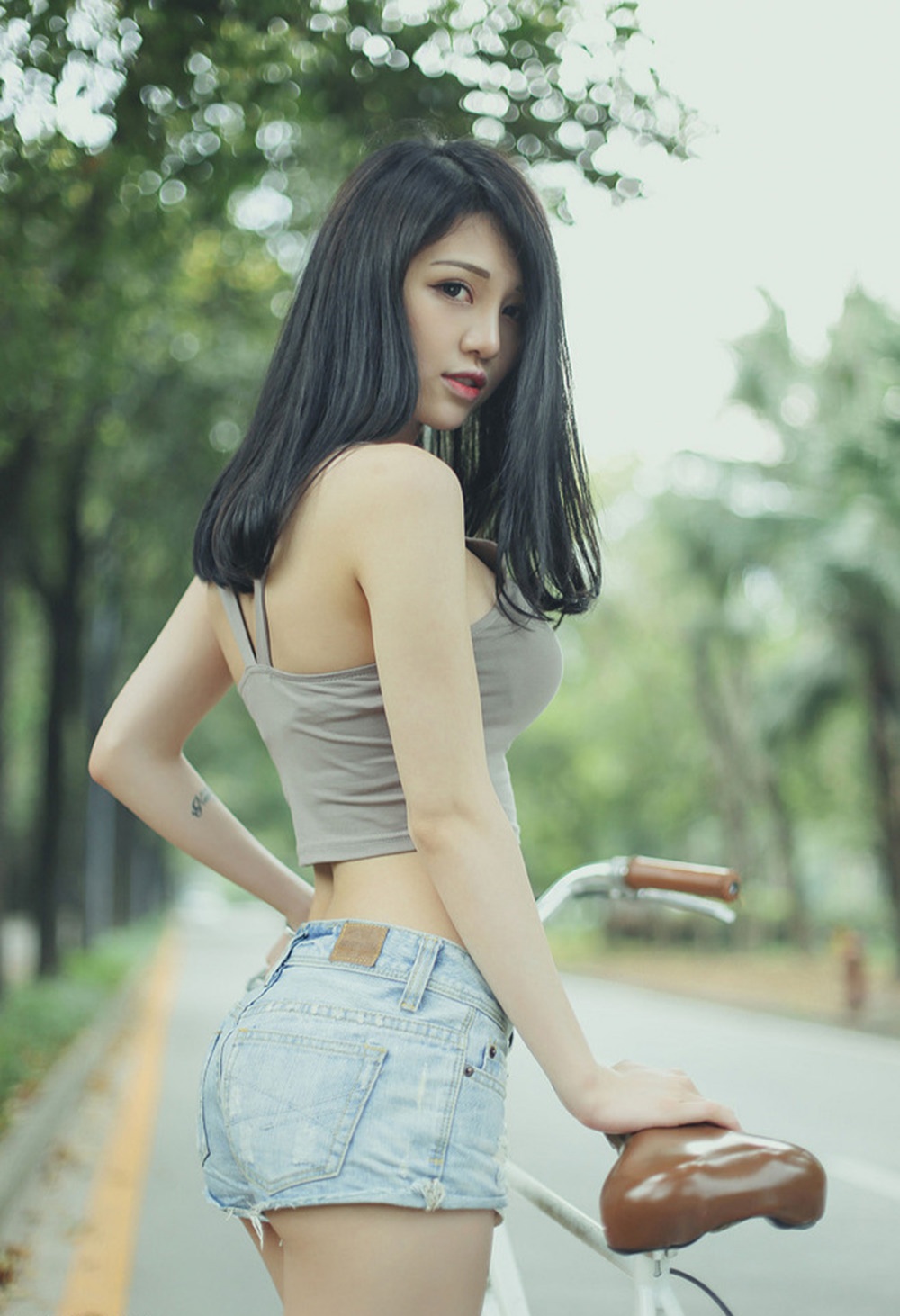 她穿着的牛仔短裤和上半身穿的适合运动的小背心很是契合,更加能把小姐姐她的修长的美腿展现出来,搭配上一双运动鞋,骑着自行车给人一种运动女神的感觉。