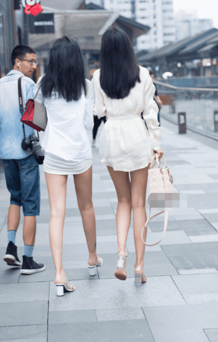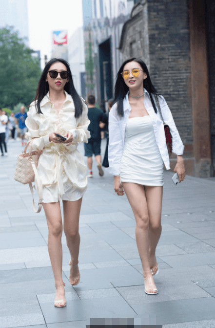 小姐姐的腿部则是穿了一条白色的短裤,这条短裤跟前嫩黄色的衣服搭配在一起简直是绝了。再看一下另一位小姐姐的衣服吧,另一位小姐姐是白色洗的风格,小姐姐穿着一件抹胸的修身小裙子这件裙子到小姐姐的大腿非常的好看,然后小姐姐的外面套了一件白色的衬衣以防止走光,叫姐姐的这一生传达非常的聪明,也非常的有气质,小姐姐走路带风,你们看他们的头发一边走一边被风吹的向后。走出了一种大姐范儿的感觉。