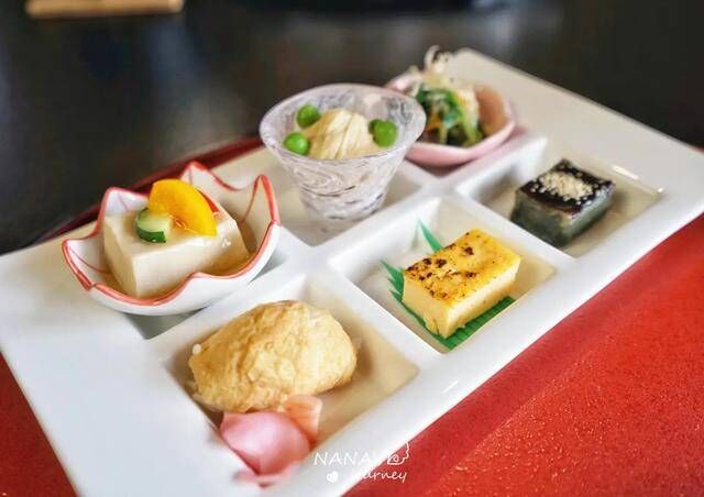 先是精致六小盆,有甜品,有糕点,有豆腐皮寿司,有凉菜,有两种豆制品,每一道都是点到为止
