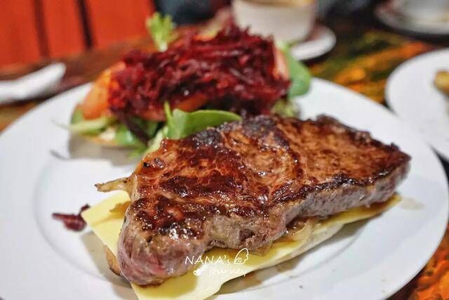 烤牛排,底下垫着芝士和烤面包,切开的时候,芝士融化融入面包,很入味,肉也是非常嫩的