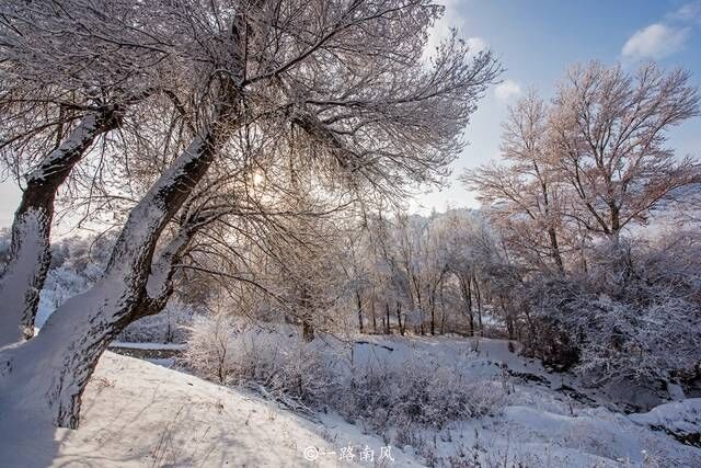 中午,我们乘坐的景区交通车在留有残雪的公路上行驶,同伴们热情高涨。由于前面刚下了一个晚上的雪,景区内所有草木都披上银装,天地白茫茫一片,只有天空是蓝色的,伙伴们一路欢呼,还没有到达目的地已经不断发出各种赞美的声音。