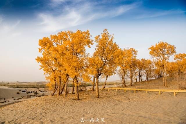 每年深秋时节都是和田大漠湖杨林最佳观赏季,无边的金黄就好像上帝不小心打翻了彩色墨盒,绘制出热情似火、梦幻非常的画面。