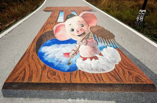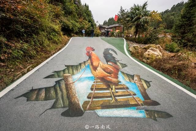 在通往千年古寨的途中,有一段路布满3D画,内容包括公鸡、老虎、蛟龙、流氓兔和各种卡通形象公仔,看起来特别逼真,好多游客忍不住和这些3D画合起了影。